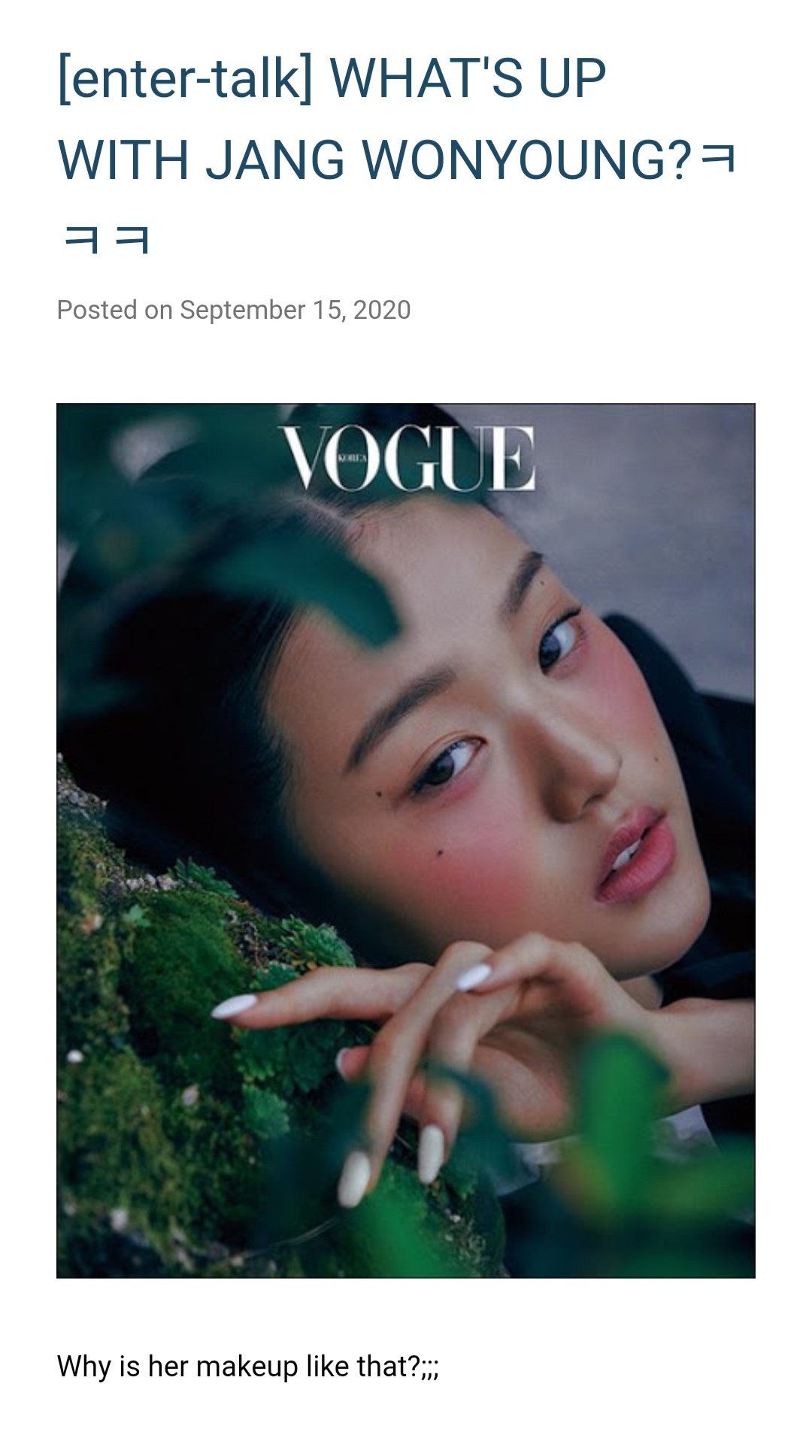 Jang Won Young Vogue / 장원영 or simply wonyoung) is a south korean singer currently under starship entertainment and off the record entertainment.